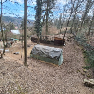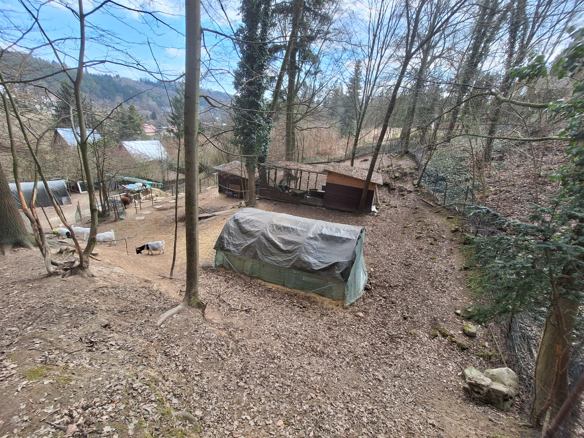 rovnější prostor je v horní části za stájí (viz fotky, nafoceno na konci března 2026). Součástí zázemí je