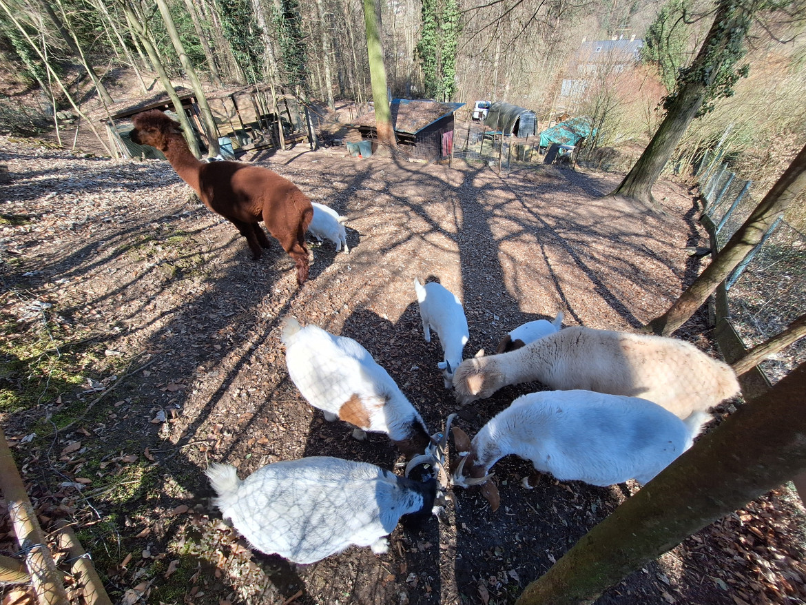 s dvěma samci lamy alpaky na chovatelském zázemí, jehož celkovou plochu 2096 m2 si pronajímáme od obce Senohraby. Prostor, kam má stádo trvalý přístup, má asi 1500 m2 a na dalších cca 500 m2,